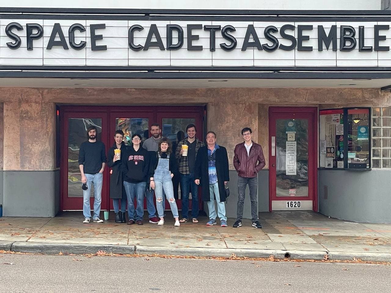 (2021) Space Group celebrating a successful first year at North Carolina State University with a private movie showing. From left to right: Logan Ritter, Meagan Mulcair, Lenore Miller, Dr. Adam Hogan, Grace O'Neill, Matthew Mostrom, Dr. Brian Space, Carlos Solanilla
