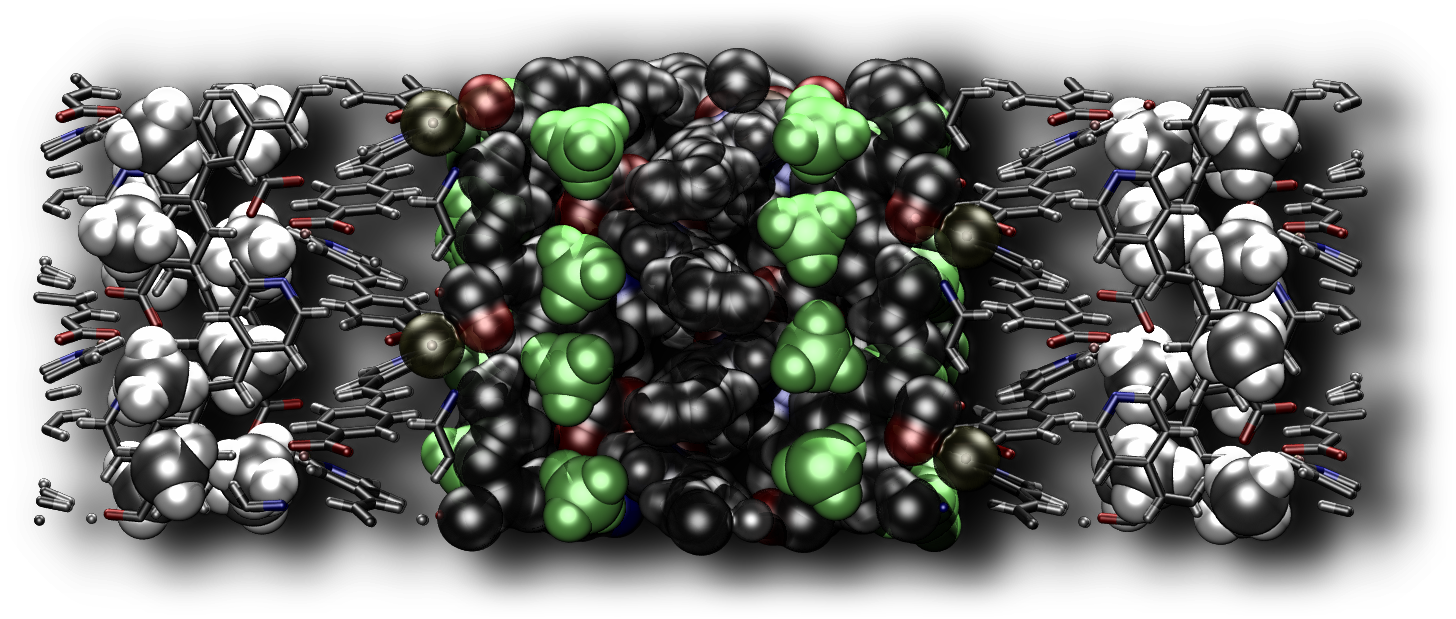 Figure Legend: The a-axis view of the 2 × 2 × 2 system cell of the metal-organic material (MOM), dia-7i-1-Co, showing multiple representations of methane (CH4) sorbed in the small pores of the framework. The system is shown using licorice representation with the exception of the central region of the framework and all CH4 molecules are depicted using space filling van der Waals illustration. Atom coloring corresponds to: C = gray, H = silver, O = red, N = blue, Co = pink; with the exception of the CH4 molecules sorbed in the central region which are colored green for visual clarity.
